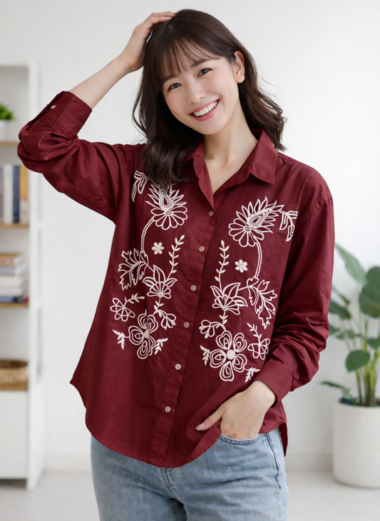 Artistic Floral Embroidered Cotton Shirt | Button-Down Long Sleeve Top