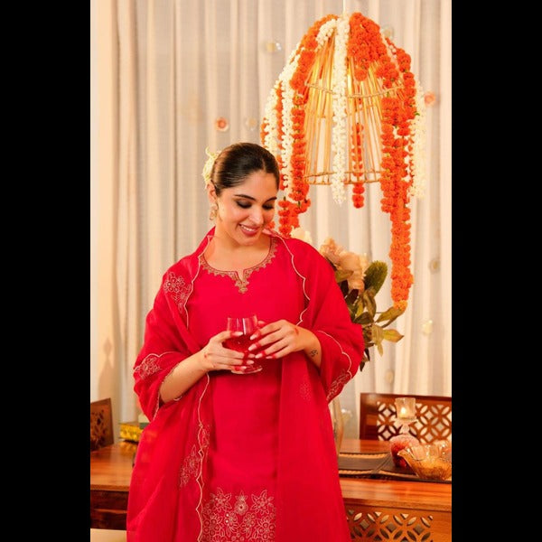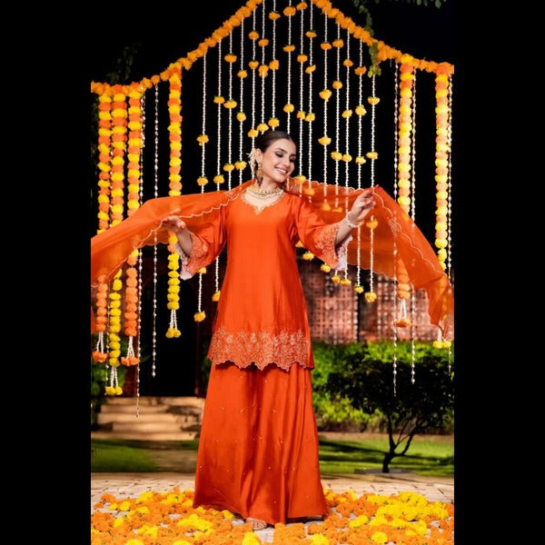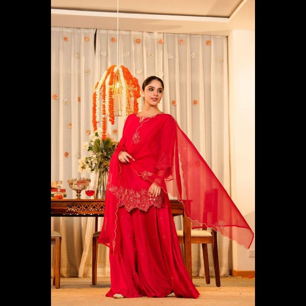 Description - Make a stunning statement with our exquisite sharara suit, intricately crafted with delicate work that exudes elegance and sophistication.